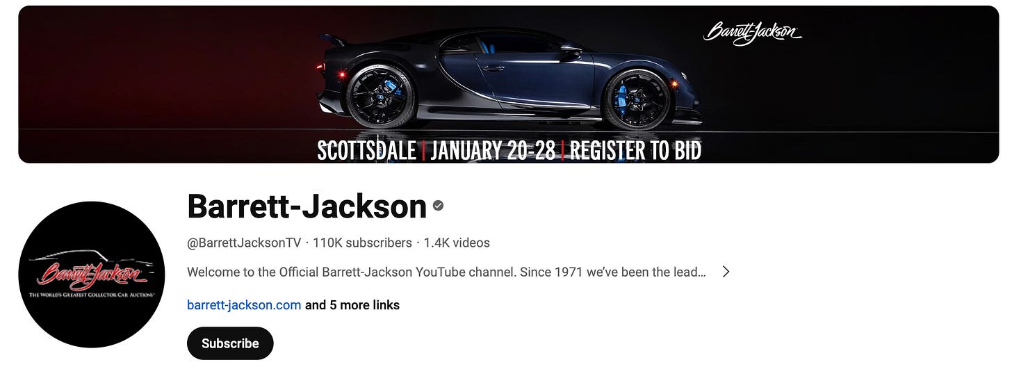 “Welcome to the Official Barrett-Jackson YouTube channel. Since 1971 we’ve been the leader of collector car auctions and automotive lifestyle events. We’re here to celebrate the love of all things cars, taking our audience on the road and up onto the auction block. Subscribe to the Barrett-Jackson YouTube Channel for definitive coverage and highlights of The World's Greatest Collector Car Auctions – as well as a look behind the scenes, exciting in-house builds and more. We can’t wait to share the Barrett-Jackson experience with you!”